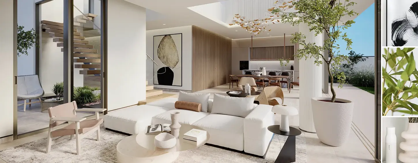 Palm Jebel Ali villas are designed with floor-to-ceiling windows that showcase sweeping beach views, complemented by a soft neutral palette and premium finishes to create a serene, luxurious living environment in these exclusive private frond neighbourhoods.